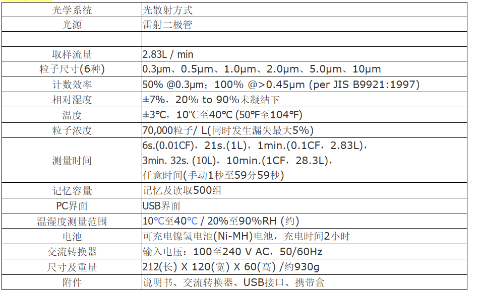 6种粒子尺寸: 0.3μm、0.5μm、1.0μm、2.0μm、5.0μm、10μm
